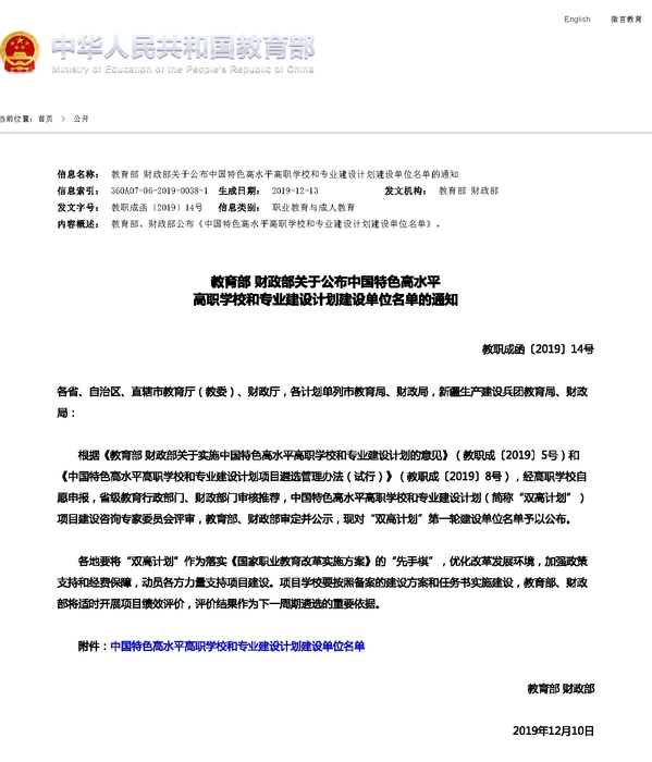 近日,教育部、财政部发布了《教育部财政部关于公布中国特色高水平高职学校和专业建设计划建设单位名单的通知》,公布了“中国特色高水平高职学校和专业建设计划”(简称“双高计划”)第一轮建设单位名单,我校成功入选为“高水平专业群建设单位”,河南省共有6所高职院校入选“双高计划”建设单位。