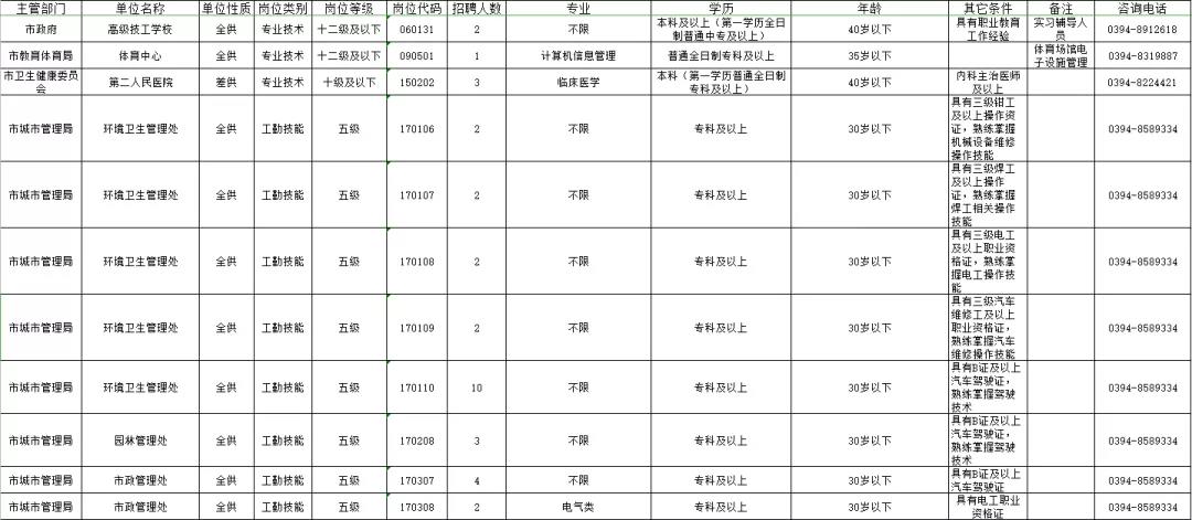 根据《河南省事业单位公开招聘规程》(豫人社〔2015〕55号)等文件规定,经市委市政府同意,2020年周口市市直事业单位拟面向社会公开招聘工作人员318名(详见附件《2020年周口市市直事业单位公开招聘工作人员岗位信息表》)。