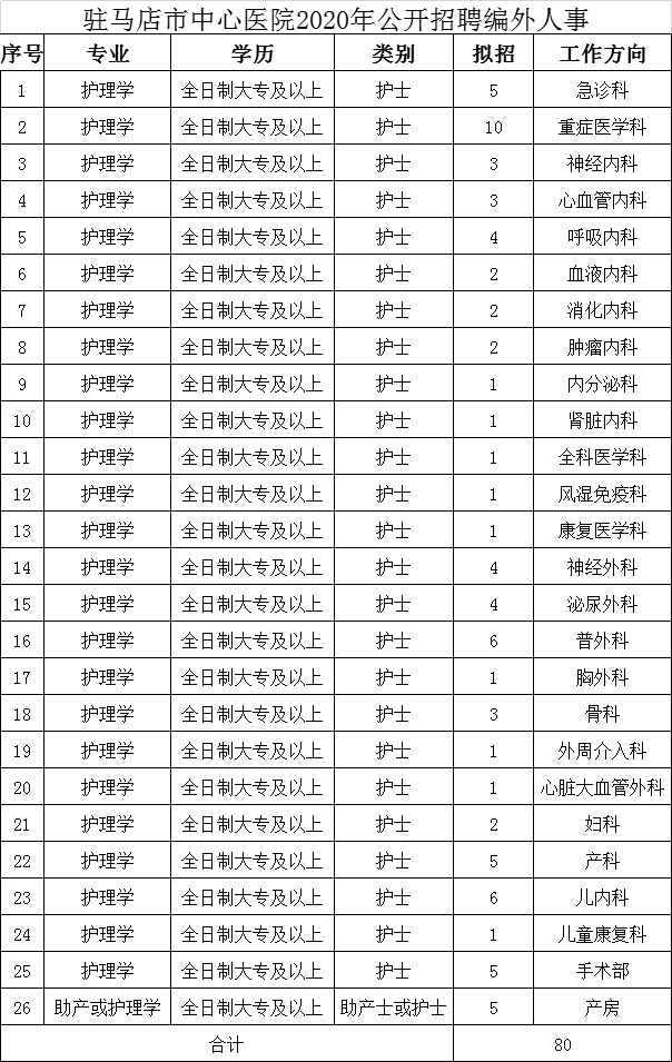 2020年共计划公开招聘80名编外人事代理护士。招聘对象为高中起点、统招护理学专业普通全日制大专及以上毕业生,且在三级甲等综合医院连续规范化培训1年以上,经医院业务主管部门考核合格的护理人员。