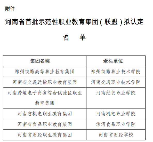 近日,根据《河南省教育厅办公室关于开展河南省示范性职业教育集团(联盟)建设工作的通知》(教职成函〔2020〕605号)文件要求,经各集团(联盟)自愿申报,省教育厅组织专家评审,我校作为牵头单位的郑州铁路高等职业教育集团成功入选,成为河南省首批示范性职业教育集团(联盟)。