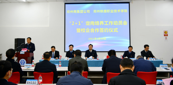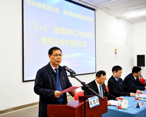 陆彦彬代表中国铁路郑州局集团有限公司对学校近年来取得的一系列成绩表示赞赏和祝贺。他表示,郑州铁院毕业生是集团公司新进人员的主要来源和宝贵的人力资源,推行高职毕业生“2+1”定向培养,从源头上把好了人员入口关,对于培养高技能人才队伍,提高技能人员素质,起到了重要作用。他从充分认识推行高职毕业生“2+1”定向培养的重要意义、抓住高职毕业生“2+1”定向培养的关键、落实“2+1”定向培养的相关责任三个方面对此次“2+1”定向培养工作提出了要求,希望将“2+1”定向培养打造为校企合作的典范,培养出更多高素质技术技能型人才。