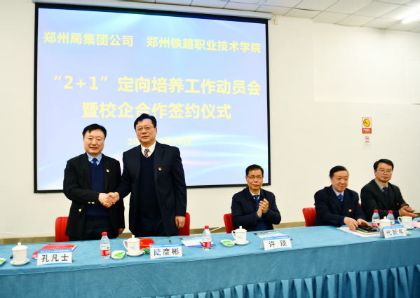 3月10日上午,我校与中国铁路郑州局集团有限公司“2+1”定向人才培养工作动员会暨校企合作签约仪式在幸福路校区举行。中国铁路郑州局集团有限公司副总经理、工会主席陆彦彬,校党委书记许琰,党委副书记、校长孔凡士,副校长王保军、倪居出席动员会暨签约仪式,中国铁路郑州局集团有限公司相关部门、各站段负责人以及学校相关职能部门、二级学院负责人参加动员会暨签约仪式。会议由副校长王保军主持。