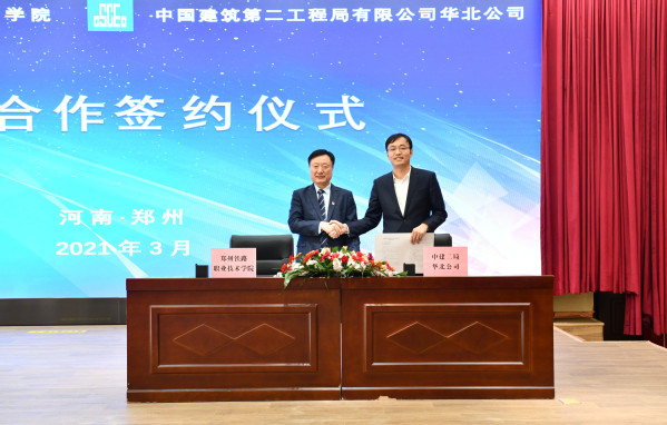 党委副书记、校长孔凡士与中建二局总经理助理、华北公司党委书记、董事长陈广玉代表双方签署校企合作协议