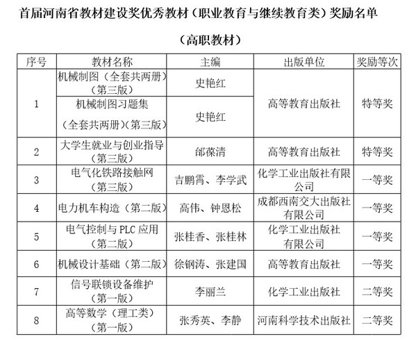首批教材建设奖的评选工作是贯彻落实习近平总书记关于教材建设的重要指示精神,展示我国教材建设特别是党的十八大以来教材建设重大成就的平台,每4年评选一次。根据中共河南省委高校工委、 河南省教育厅印发的《关于公布首届河南省教材建设奖评选结果的通知》(教思政〔2021〕144号),我校推荐的8部教材获得首届河南省教材建设奖(职业教育与继续教育类),其中特等奖2项、一等奖4项、二等奖2项,7种教材被推荐参评首届全国教材建设奖,4种教材获得首届全国教材建设奖,在获奖数量和质量方面均居全省高职院校之首。