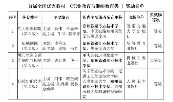 近日,教育部发布《国家教材委员会关于首届全国教材建设奖奖励的决定》(国教材〔2021〕6号),我校4种教材荣获首届全国教材建设奖。其中,高伟、钟恩松老师主编的《电力机车构造(第2版)》被评为国家一等奖。该奖项成为继国家级教师教学创新团队、国家级教师教学能力比赛之后,我校在“三教”改革领域的又一重大突破。