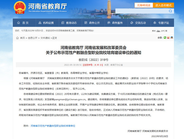 近日,河南省教育厅公布了河南省首批示范性产教融合型职业院校培育单位评选结果,全省高职院校仅有14个单位获批示范性产教融合型职业院校培育单位,我校成功入选。