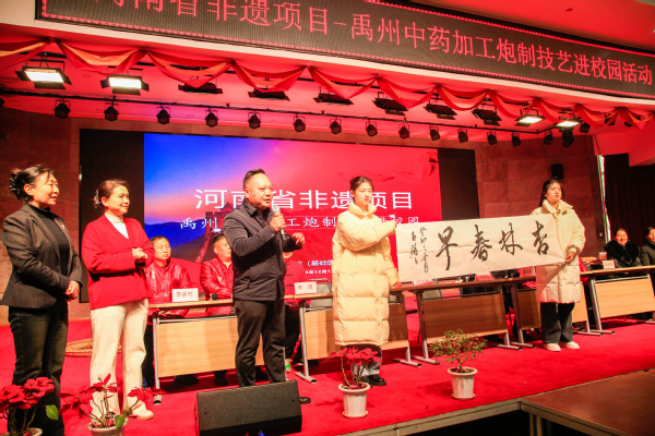 首先,药学院党总支书记阮丽红代表学院对各位非遗传承人的到来表示热烈的欢迎,并为传承人逯安新、黄潇、李敏生、赵永举、李琦、王超伟、李彦村等颁发了“药学院技能大师”聘书。许昌市级非遗传承人黄潇为学院赠送“杏林春早”书法作品,并讲解了“杏林”典故的来历。