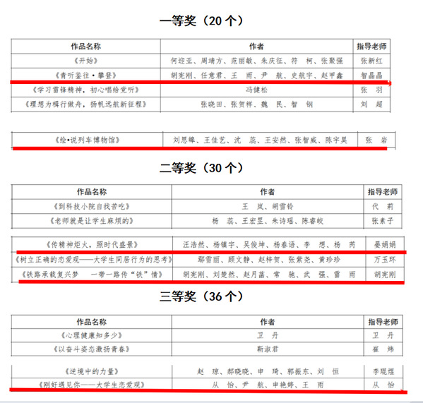 其中智晶晶老师和张岩老师指导的作品获一等奖,晏娟娟老师和胡宪刚老师指导的作品获二等奖,从怡老师指导的作品获三等奖。