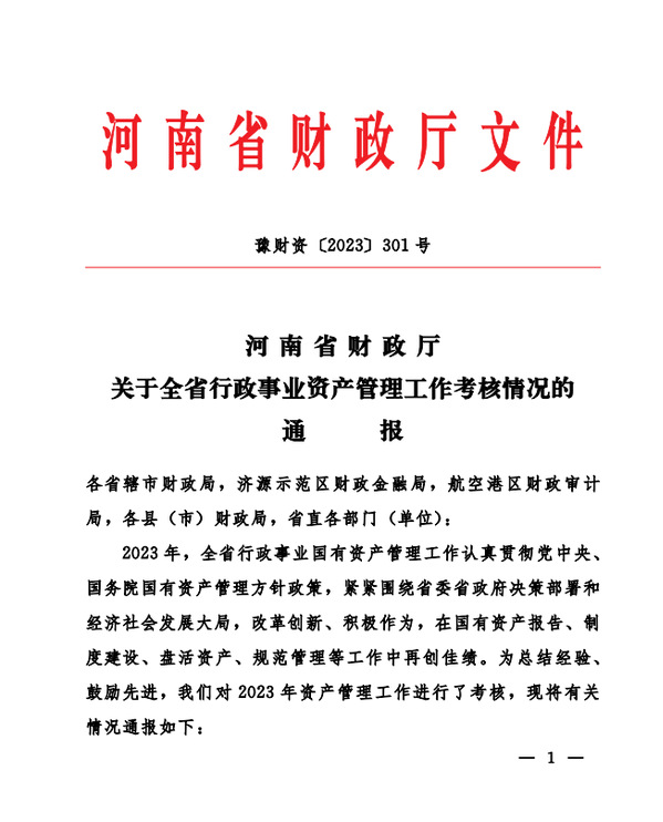 近日,河南省财政厅发布《关于全省行政事业资产管理工作考核情况的通报》(豫财资〔2023〕301号),公布了2023年度全省行政事业资产管理考核情况,本次通报表扬的高职院校共有6所,我校获得全省通报表扬,这是我校自2019、2021年之后第三次获此殊荣。