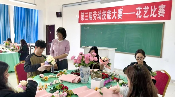 在商学院承办的花艺比赛中,选手们展示了创意与巧手,在规定时间内有条不紊地完成了花束制作、篮花制作、瓶花制作或主题花艺制作,体现了新时代大学生的创新能力和动手能力。