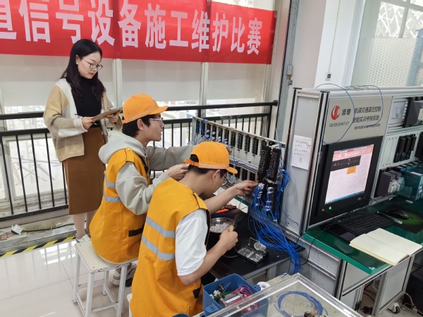 在电子工程学院承办的铁道信号设备施工维护技能赛项主要分为两个环节:道岔控制系统施工技能和道岔控制系统故障处理。在比赛过程中,选手们严格遵守安全操作规程,彰显了严谨细致、吃苦耐劳的劳模精神。
