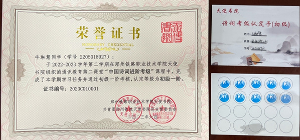 持续组织开展和推广通识教育课程学习考核认定及传统文化类第二课堂系列学生活动,自主编制通识教育校本教材《中国诗词考级手册》一套六辑,设置初、中、高三个等级、六个阶段,引导学生积极参与课程学习和第二课堂活动。截止目前共计200名学生完成课程学习与考核,获得由书院自主编码的“中国诗词进阶考级”认定证书。