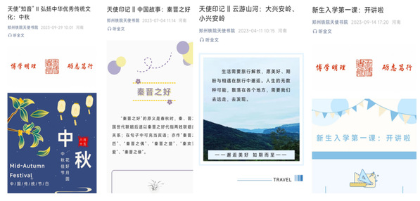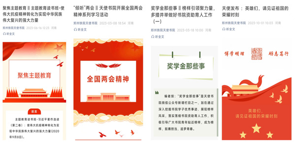 书院网站自2021年9月建成以来,累计发文600篇;微信公众号自2022年3月开通以来,设有走进天使、知识角、馨语心苑等三大功能,内容涵盖天使发布、天使“知音”、天使印记、聚焦二十大、聚焦主题教育、“倾听”两会、奖学金那些事、新生入学第一课、天使阅览室、助学筑梦、志愿天使、就业小帮手等十二模块,累计发文530篇,总用户数7000余人;书院微信视频号、书院抖音、哔哩哔哩动画等短视频平台累计发布视频120余个,累计直播30场;书院橱窗制作“天使启航”院报4期,已发布2期。汇编2册《天使书院网络思政育人成果》集,书院各媒体平台累计点击率达55万人次以上。网络育人案例分别荣获学校“十大”育人示范案例、2022年学生工作典型案例一等奖。