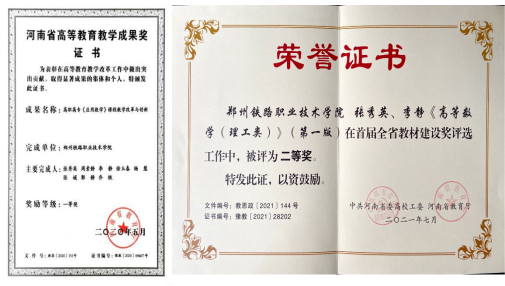 省部级荣誉奖励214项。其中全省教育系统教学技能大赛一等奖1项,河南省教师能力大赛一等奖1项,河南省工会教学竞赛一等奖2项,河南省教育厅信息化教学比赛一等奖1项,河南省高等职业教育课堂教学创新大赛一等奖2项,河南省高等职业教育教学能力大赛二等奖5项,河南省高等职业教育课程思政教学创新大赛三等奖1项,亚太地区大学生数学建模竞赛优秀指导教师一等奖1人,河南省“互联网+”大学生创新创业大赛优秀创新创业指导教师1人,挑战杯优秀指导教师2人,全国大学生数学建模竞赛省级一等奖66项、二等奖72项、三等奖36项,河南省“挑战杯”大学生课外学术科技作品竞赛一等奖1项、二等奖4项、三等奖6项,第15届“中国电机工程学会杯”全国大学生电工数学建模竞赛三等奖3项,河南第五届中华经典诵写讲大赛省级一等奖4项、二等奖1项,河南省第七届大学生艺术展演活动省级一等奖1项、二等奖4项、三等奖2项,河南省高等职业教育技能大赛英语口语一等奖1项,职场英语挑战赛演讲大赛一等奖1项,职场英语挑战赛写作大赛一等奖1项、二等奖2项,外教社词达人杯全国大学生英语词汇能力大赛特等奖3项、一等奖3项、二等奖9项、三等奖6项。