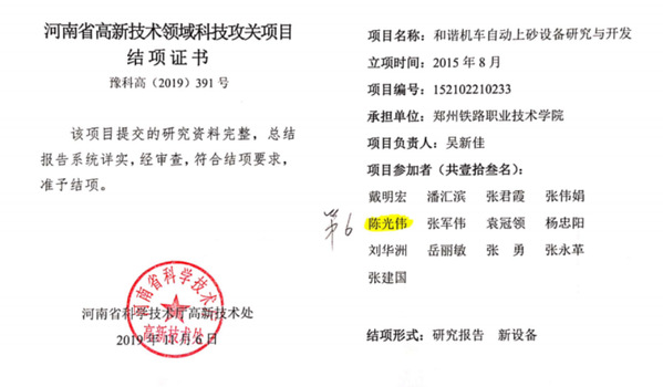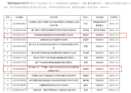 吴新佳立项省级科技攻关课题《保证和谐机车安全运行的自动上砂设备研究与制造》;宁广庆立项省级科技攻关课题《铁路抄平起拨道捣固车模拟操作实训平台的开发与研究》;冯雅珊立项省级科技攻关课题《β-磷酸三钙/胶原复合纤维涂层调控镁合金降解和生物活性的机制研究》;郭海伟立项省级科技攻关课题《轻质高吸波屏蔽隔热材料制备关键技术及应用》;毛胜辉立项省级科技攻关课题《基于MEMS的“可穿戴”铁路大机液压系统内泄非拆解探测关键技术研究》。