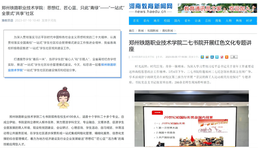坚持以文化人以文育人的目标,按照整体设计,合理布局,功能齐全,分步实施的步骤,紧扣“红”“蓝”“青”三色调,制定了“思想红、匠心蓝、只此青绿”的主题思路,进一步将文化充分融入书院空间载体中,增强学生对书院文化的认同,让学生在书院文化浸润中实现学习生活成长的全景式“共享”。我院加强“一站式”社区建设,深化文化育人的经验做法被豫教思语、河南教育网等媒体先后报道。