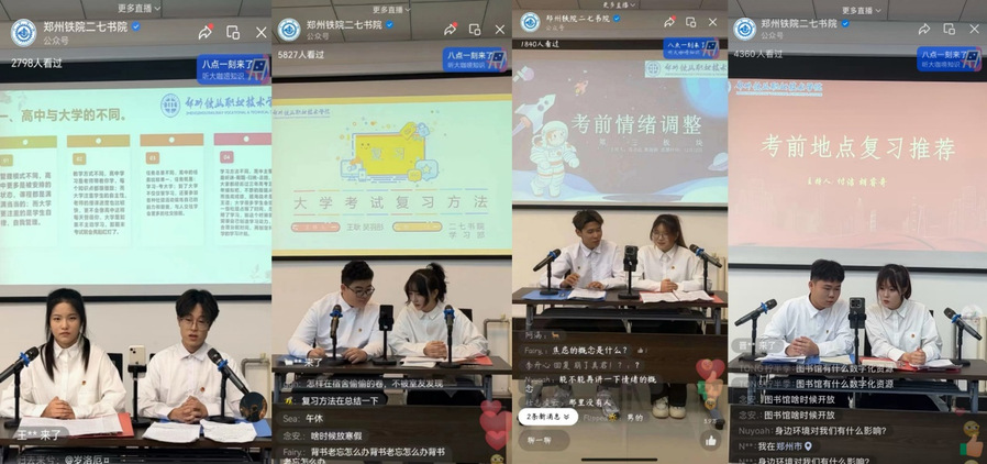 依托书院微信公众号、微信视频号和官网,选择学生关注热点,回应学生关切。“郑州铁院二七书院”公众号发布推送99篇,公众号粉丝新增2000多位,《超燃!多图直击运动会现场!》《毕业季|时光飞逝,珍藏美好记忆》等17篇推送内容浏览量破千,其中《“落叶成画绘美景,同心喜迎新时代”主题落叶绘画比赛》浏览量近7000人次。视频号发布内容浏览量均破4000人次,其中1条视频浏览量破万。公众号直播9场,“考前复习这样做”直播4场,单场点赞最高超15万,有效提升了学生思政工作主体的参与度、思政教育的针对性和亲和力。
