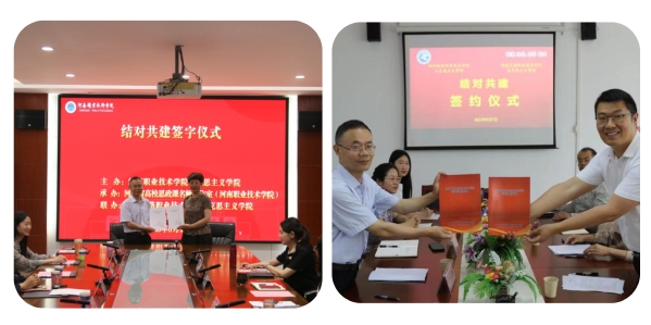 为贯彻落实《关于加强新时代马克思主义学院建设的意见》文件精神的具体举措,进一步发挥我校马克思主义学院的优势特色。马克思主义学院与河南交通职业技术学院、河南职业技术学院马克思主义学院签订结对共建协议,构建“资源共享、优势互补、协同配合、共同提高”的思政课建设新格局。