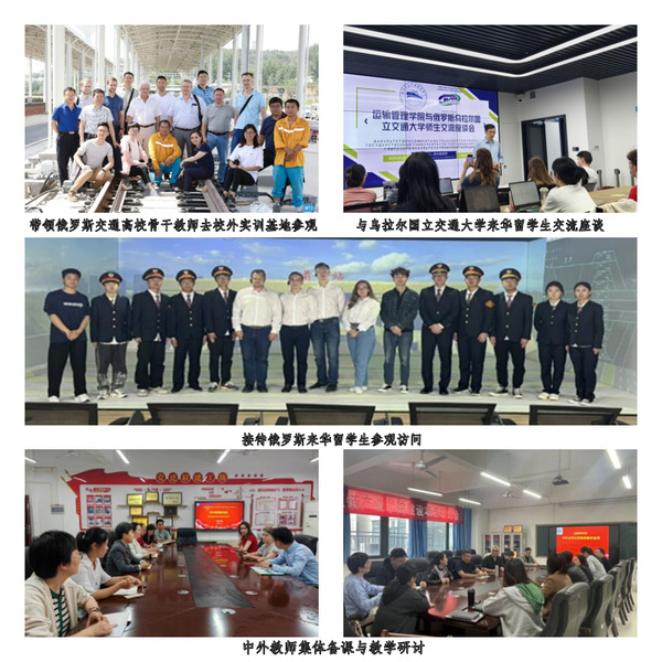 铁道交通运营管理专业、现代物流管理专业与俄罗斯国立交通大学、圣彼得堡国立交通大学、澳大利亚霍尔姆斯学院三所大学长期开展合作办学。每年双方从专业课程、实习实训、人才培养、就业方向等多方面探讨和交流,沟通专业方面的教学理念和技术运用,分享了各自国家的教学经验,提升学院的国际化教育教学水平。参与外籍教师和学生的参观培训活动在近10次,为“一带一路”建设和中国高铁“走出去”贡献智慧和力量。参与首批俄罗斯交通高校骨干教师培训班教学,助推两国关系提质升级,促进轨道交通事业普惠发展。顺利完成乌拉尔国立交通大学来华留学生教学任务,提高中国铁路的辐射面和影响力,提升学校跨境产教协同能力。
