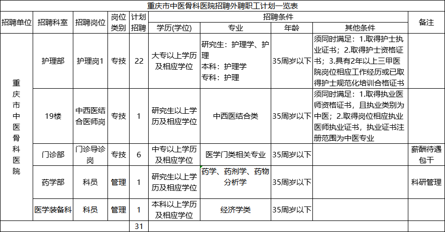 2.资格审查由招聘方现场确认应聘人员提供的报名材料与报考资格的相符性。因不同学历层次造成专业称谓不一致的,由招聘方予以审核认定。本简章所要求的条件中,所指“以上”“以下”“以前”“以后”均包含本级(数),如35周岁以下,均含35周岁,以此类推。具体岗位要求详见《重庆市中医骨科医院外聘职工招聘计划一览表(2024年第三季度)》。