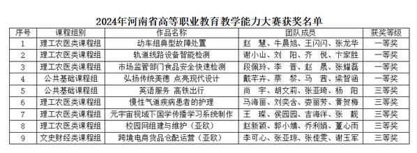 近日,河南省教育厅公布2024年河南省高等职业教育教学能力大赛获奖名单,我校取得优秀成绩,荣获省一等奖4个、三等奖5个,获奖数量为全省高职院校最多。
