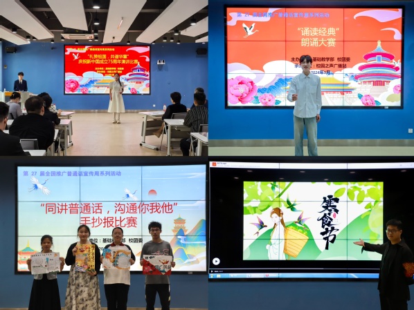 学校通过多渠道、多形式的宣传动员,营造了浓厚的推普氛围。活动期间,校园显著位置悬挂宣传横幅,精心策划了“礼赞祖国,共谱华章”庆祝新中国成立75周年演讲比赛、“诵读经典”朗诵比赛、“同讲普通话,沟通你我他”手抄报比赛以及“我们的节日”微视频比赛等系列丰富多彩的活动。此次活动覆盖了不同年级、不同专业的学生群体,我校留学生也积极参与其中。