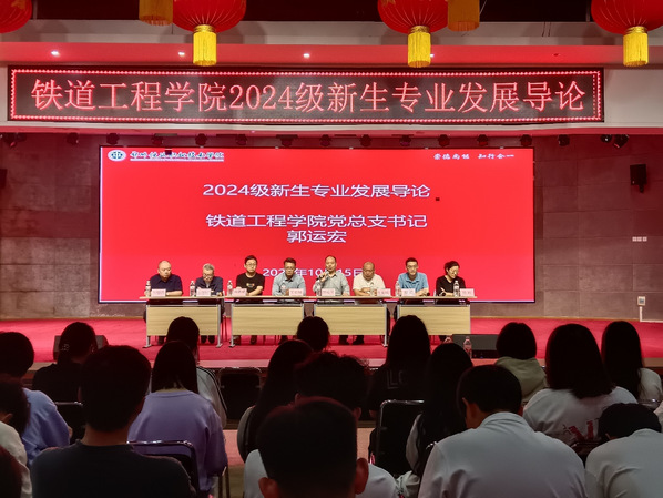 10月16日,铁道工程学院携手丝路书院、复兴书院,在大学生活动中心召开2024级新生专业发展导论会,导论旨在帮助新生更好地了解专业前景,明确个人发展方向,激发学习热情和专业兴趣。铁道工程学院党总支书记郭运宏、党总支副书记赵亮、副院长陈彦恒以及丝路书院党总支副书记任冉、复兴书院副院长胡林珺、铁道工程学院各教研室主任参加。