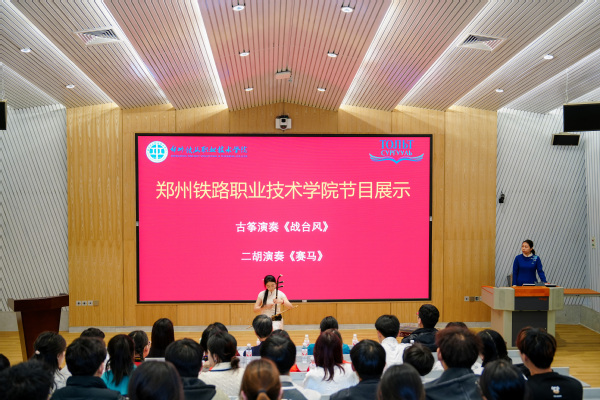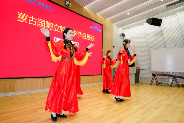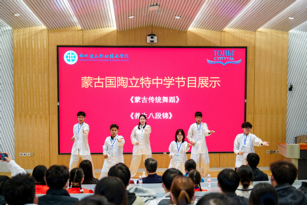 仪式上,我校国际教育学院学生表演了古筝演奏《战台风》、二胡演奏《赛马》。蒙古国陶立特中学学生带来了蒙古传统舞蹈和“养生八段锦”表演。