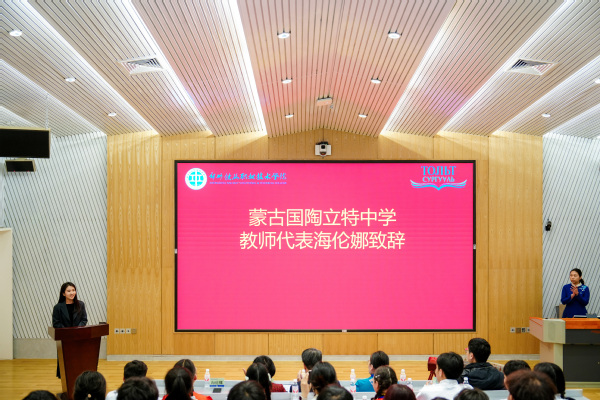 蒙古国陶立特中学教师海伦娜在致辞中表示,参加“汉语桥”来华体验交流,对所有蒙古国师生来说是一次特殊的经历。尤其是学生初次接触中国“复兴号”高铁,让他们对中国高铁技术发展有了新的认识。学校组织的高铁模拟驾驶、地铁实训体验、非遗文化参观等活动,给他们留下了难忘的回忆。希望两校在汉语教育和文化交流方面能进一步开展合作。