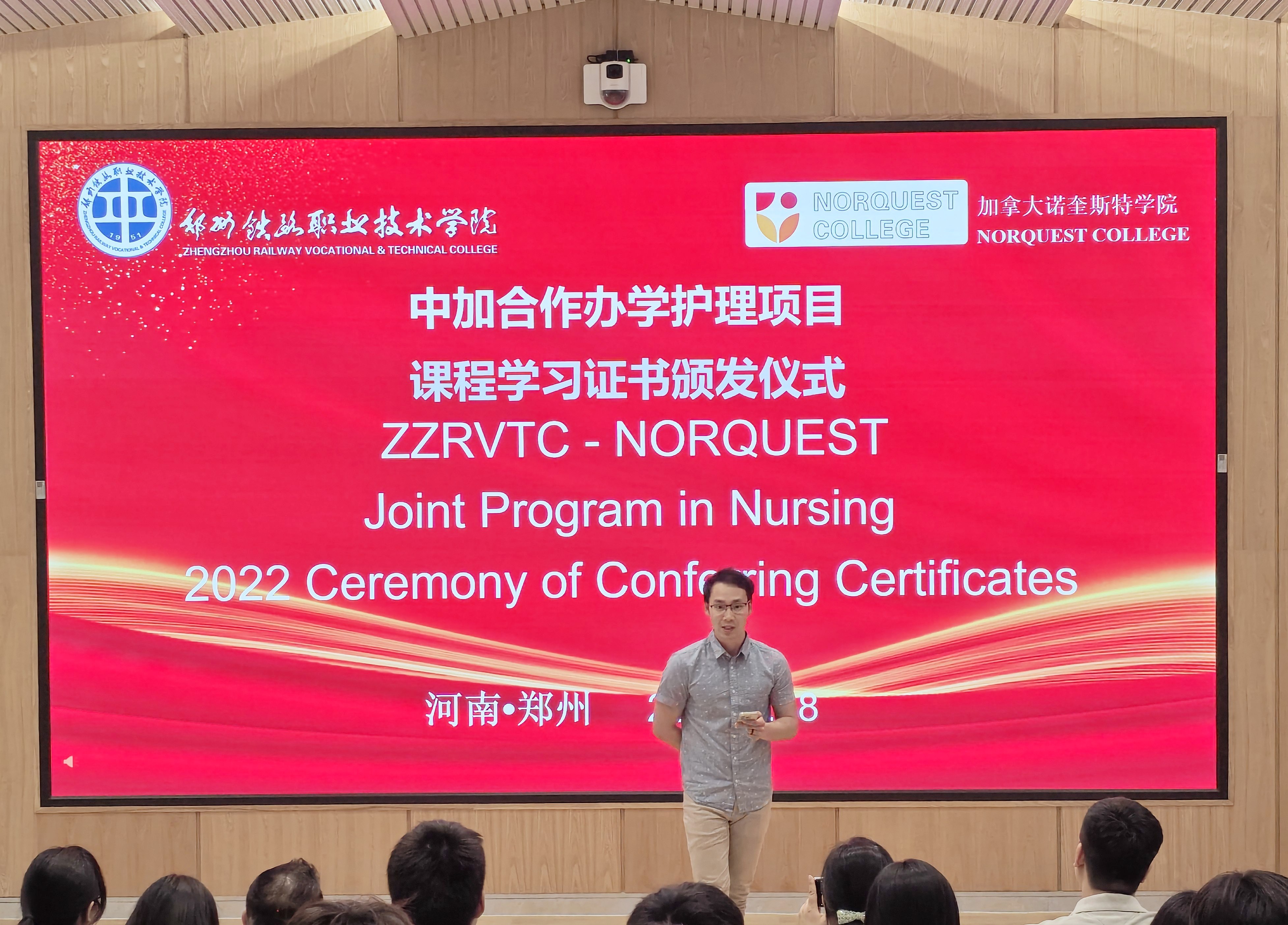 加拿大诺奎斯特学院教师Jia Cheng Zhang在发言中表示,此次项目的成功不仅是对学生们辛勤学习的肯定,也是中加合作办学的优秀成果表现。他特别赞赏学生们展现出的学习热情和专业追求,期待同学们能够融汇东西方护理智慧,成长为具有国际竞争力的护理人才。