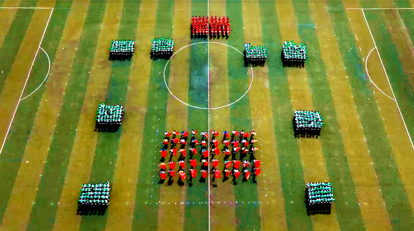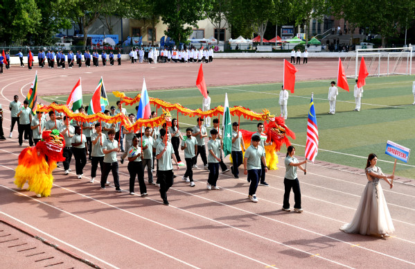 开幕式后,大型团体操震撼表演。500名学生手握彩扇、挥动彩旗,伴随着动感的音乐变换队形,运动赛场上洋溢着蓬勃向上、勇于拼搏的青春气息。