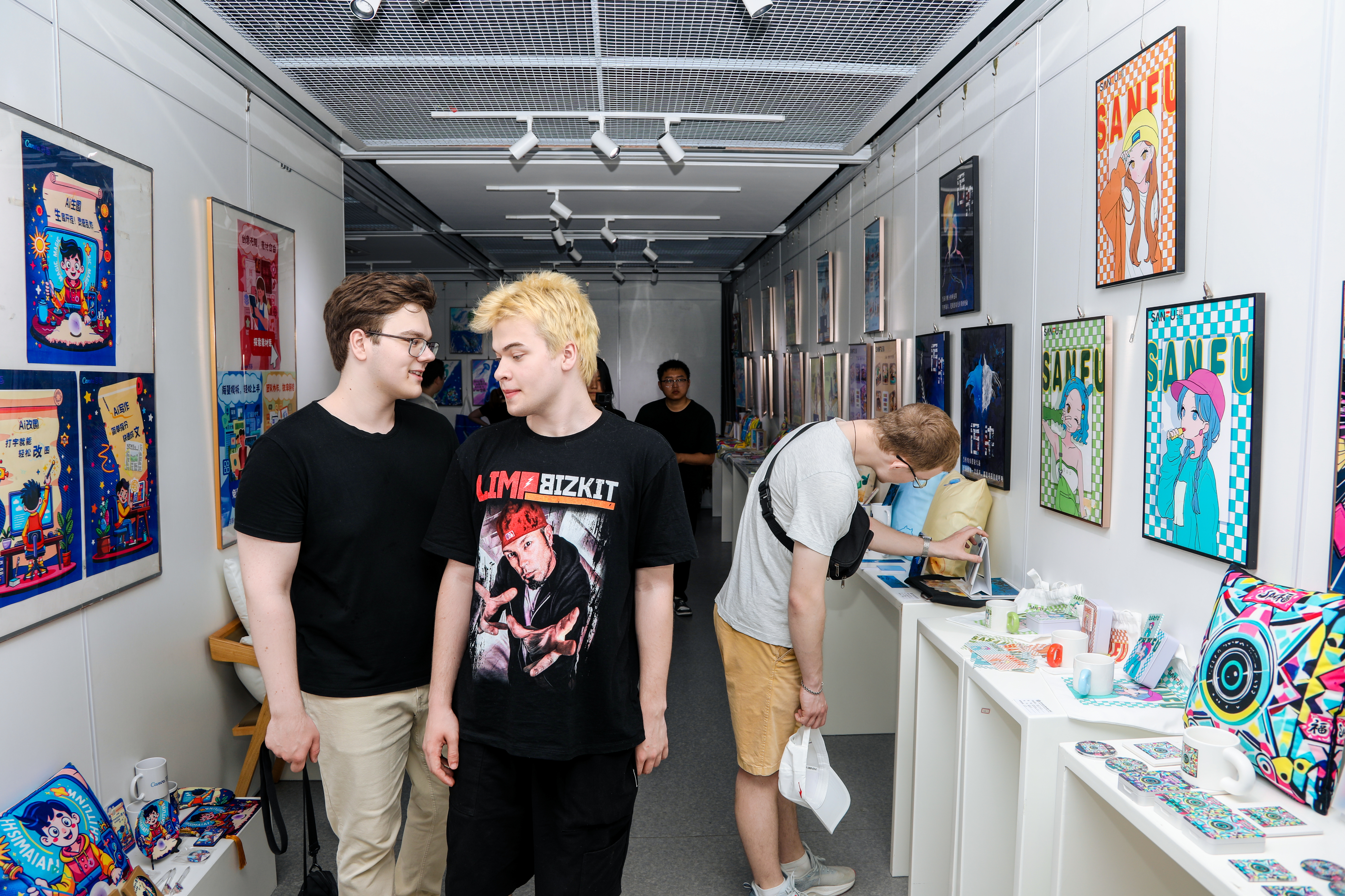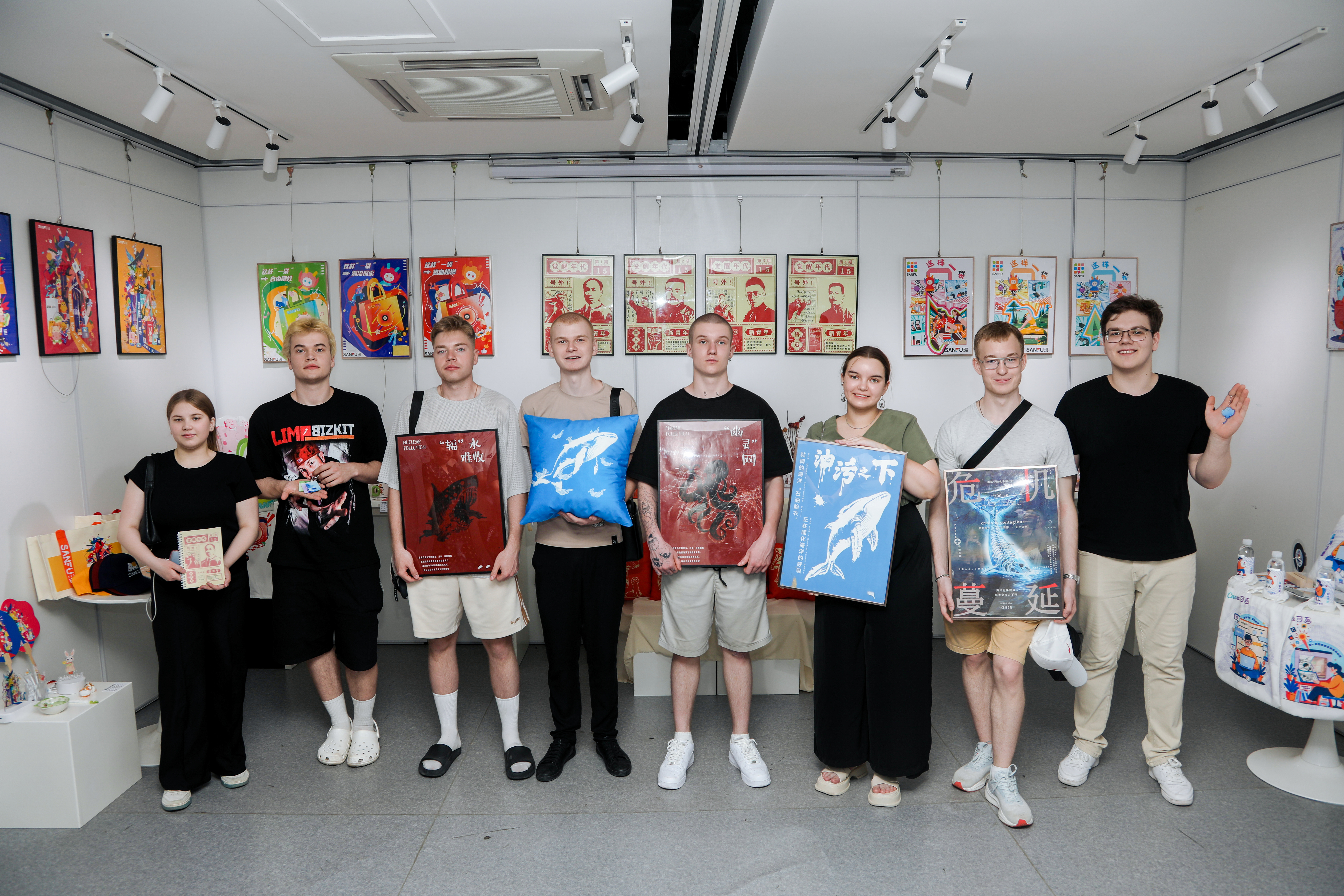 在展览现场,留学生对创意作品表现出浓厚兴趣。本次毕业设计展以“传统与现代的融合”为主题,涵盖了品牌设计、插画、动态视觉、包装设计等多个领域,部分作品还融入了中国传统文化元素,如书法、年画、剪纸等,展现了视觉传达设计专业学生们对中华美学的创新诠释。他们在参观过程中不时驻足交流,询问创作理念和技术手法,并与中国学生分享俄罗斯的艺术风格与设计趋势。