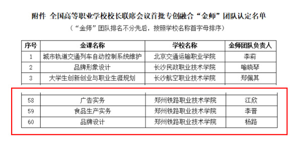 近日,全国高等职业学校校长联席会议公布了双创教育专委会首批专创融合“金师”团队名单,历经申报材料初审、课程建设和教学实施情况复审、团队现场答辩终审等环节,最终,我校创新创业学院江欣主持的《广告实务》课程团队、药学院李晋主持的《食品生产实务》课程团队和艺术学院杨路主持的《品牌设计》课程团队,从全国510个申报团队中脱颖而出,成功入选全国首批60个专创融合“金师”团队。