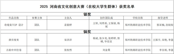 以赛促学,以美育人,文化创新显锋芒。我校在“2025年河南省文化创意大赛”中凭借卓越的创意设计和扎实的专业功底,荣获三项省级奖项。