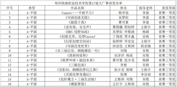 我校在本届大赛中再创佳绩,荣获16项大奖,其中省赛“一等奖”8项,省赛“二等奖”4项,省赛“三等奖”4项,彰显了学校创新人才培养模式和美育教育的显著成效。