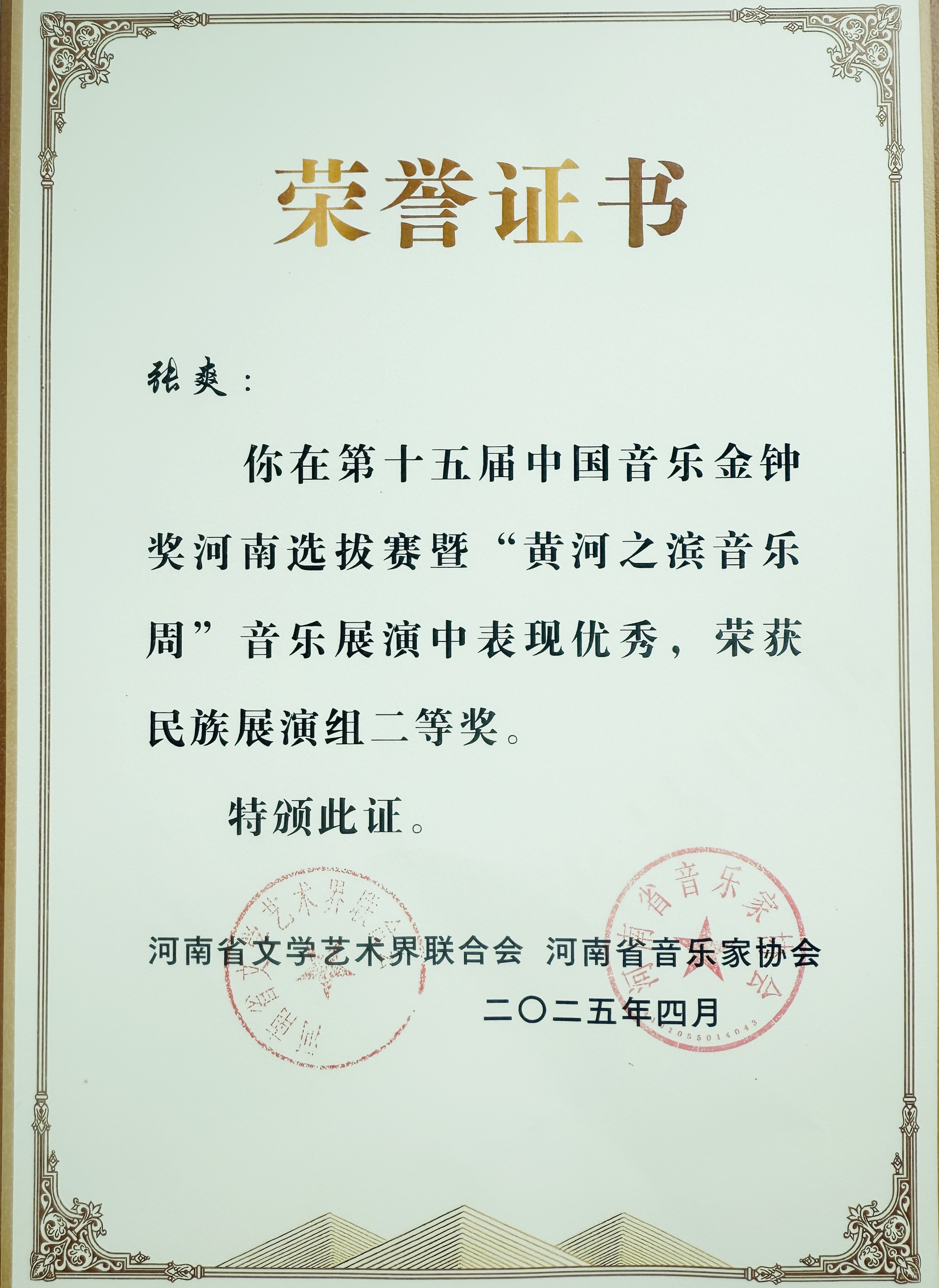 近日,由河南省文学艺术界联合会、河南省音乐家协会联合主办的第十五届中国音乐金钟奖河南选拔赛暨“黄河之滨音乐周”音乐展演活动圆满落幕,我校艺术学院教师张爽凭借精湛的专业技艺与出色的舞台表现,在激烈角逐中脱颖而出,最终斩获民族展演组“二等奖”,充分彰显了我校艺术学科教师队伍的过硬专业素养与教学实力。