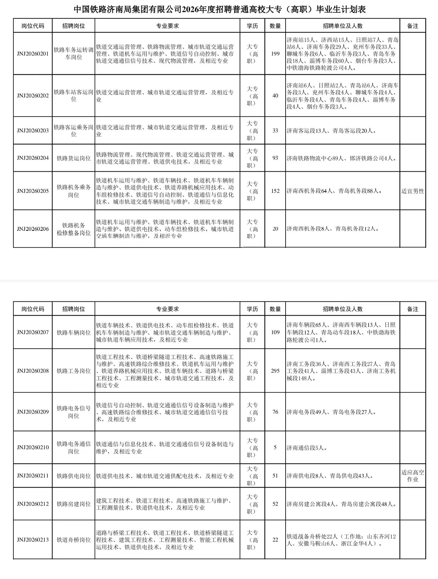 4.具备正常履行岗位职责的身体条件和心理素质,视力、听力、辨色力正常,身心健康。其中代码JNJ20260205岗位要求身体条件符合《铁路机车车辆驾驶人员健康检查规范》规定的标准。
