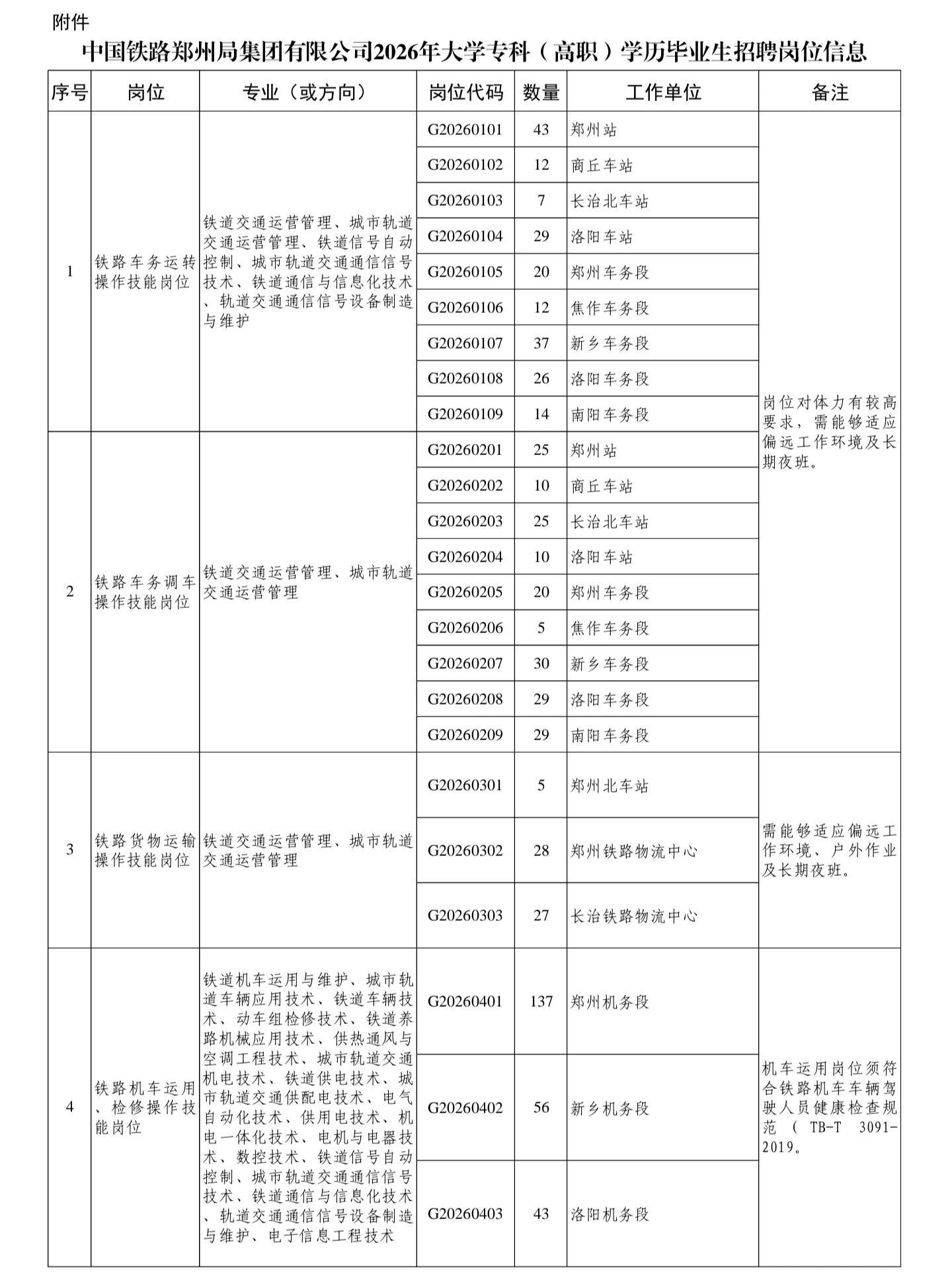 根据企业发展需要,中国铁路郑州局集团有限公司拟招聘全日制普通高等院校大专(高职)学历毕业生,现将有关事项公告如下: