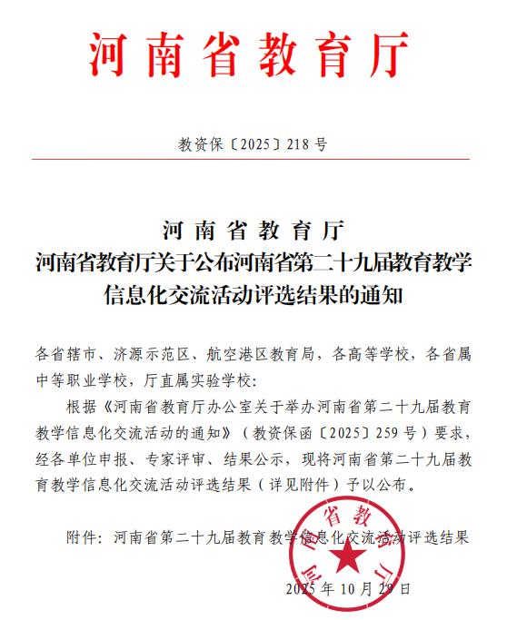 近日,河南省教育厅公布了河南省第二十九届教育教学信息化交流活动评选结果(教资保〔2025〕218号),我校共有10件作品获奖,其中一等奖1项、二等奖5项、三等奖4项,获奖总数位居全省高职院校前列。