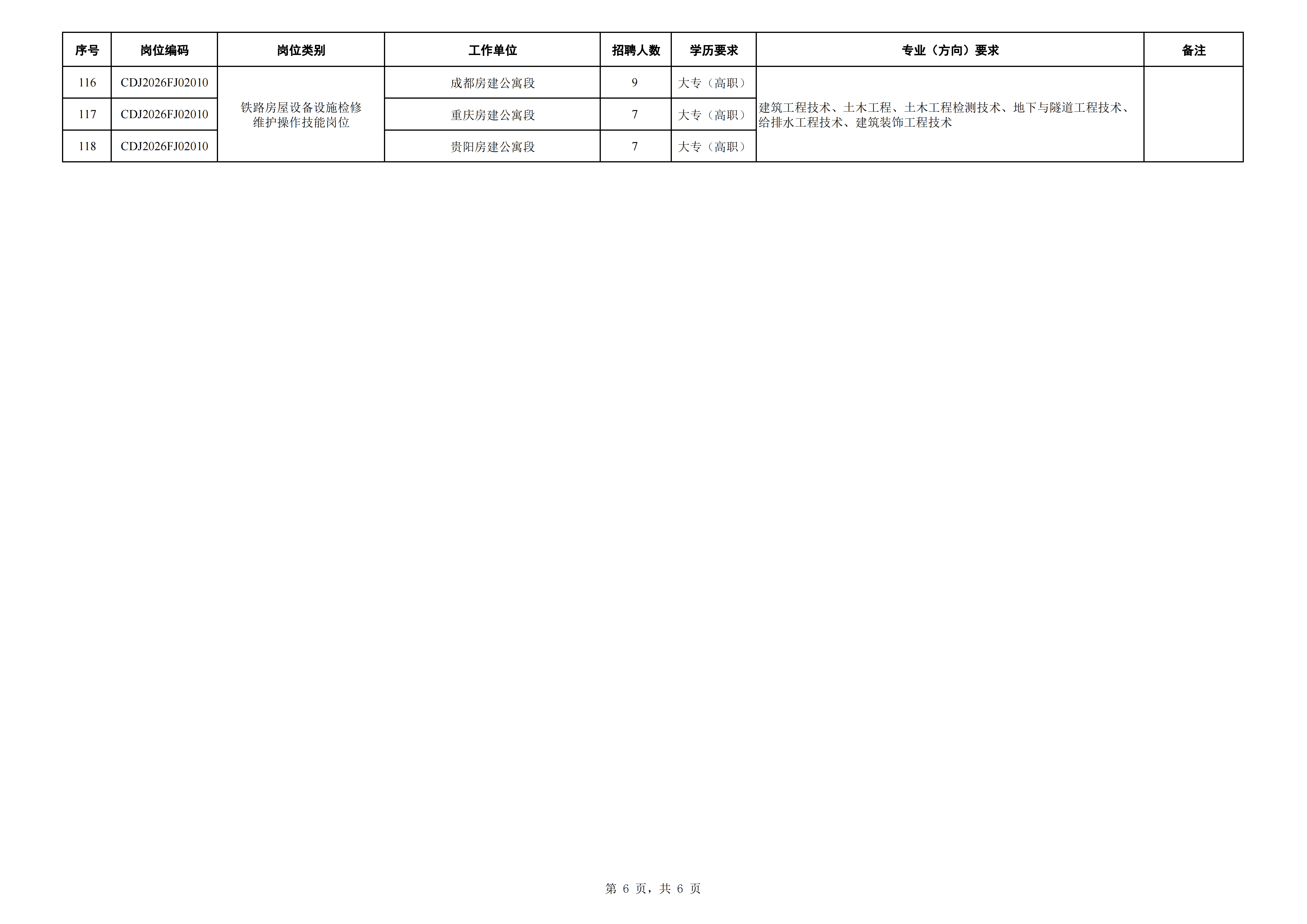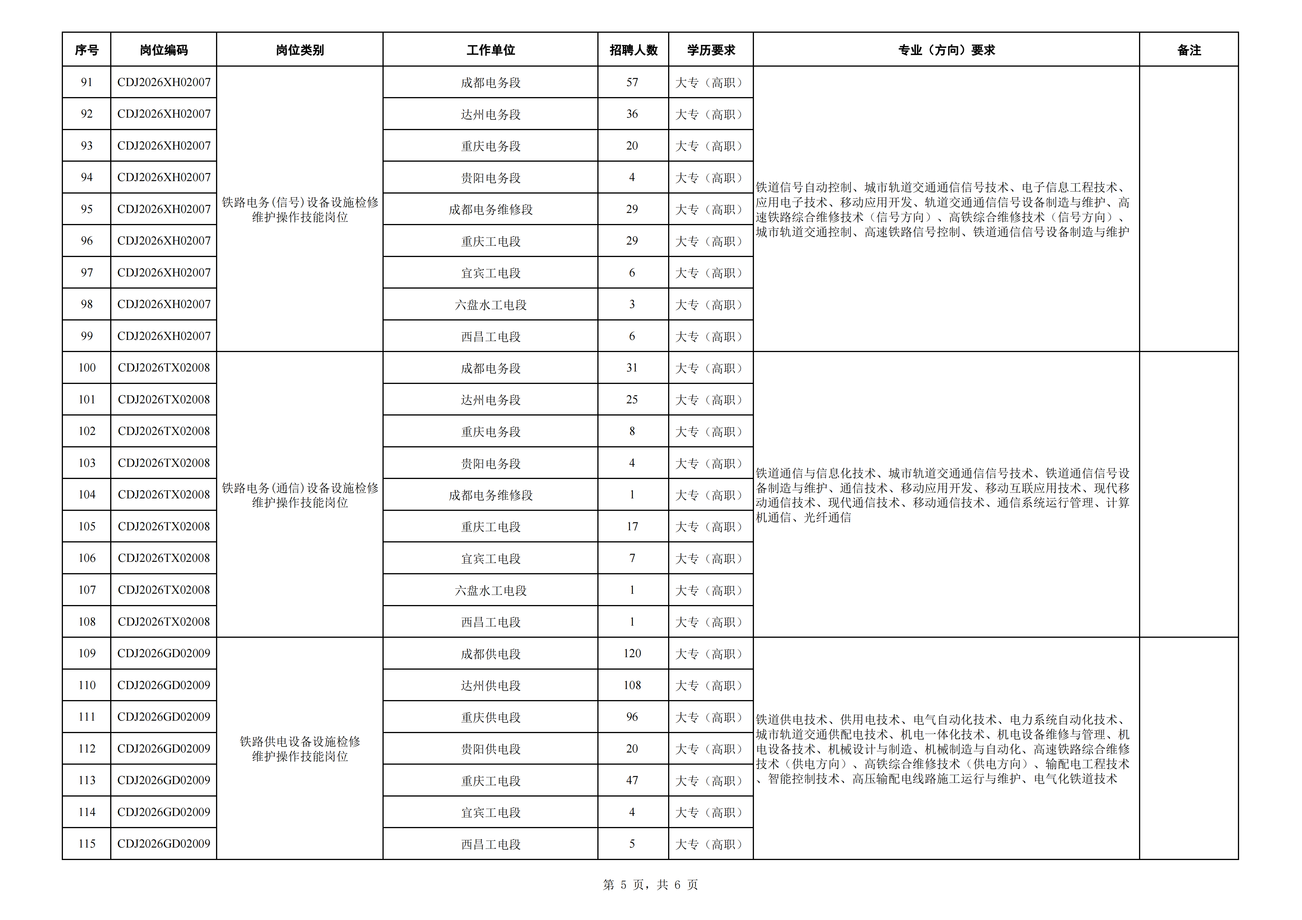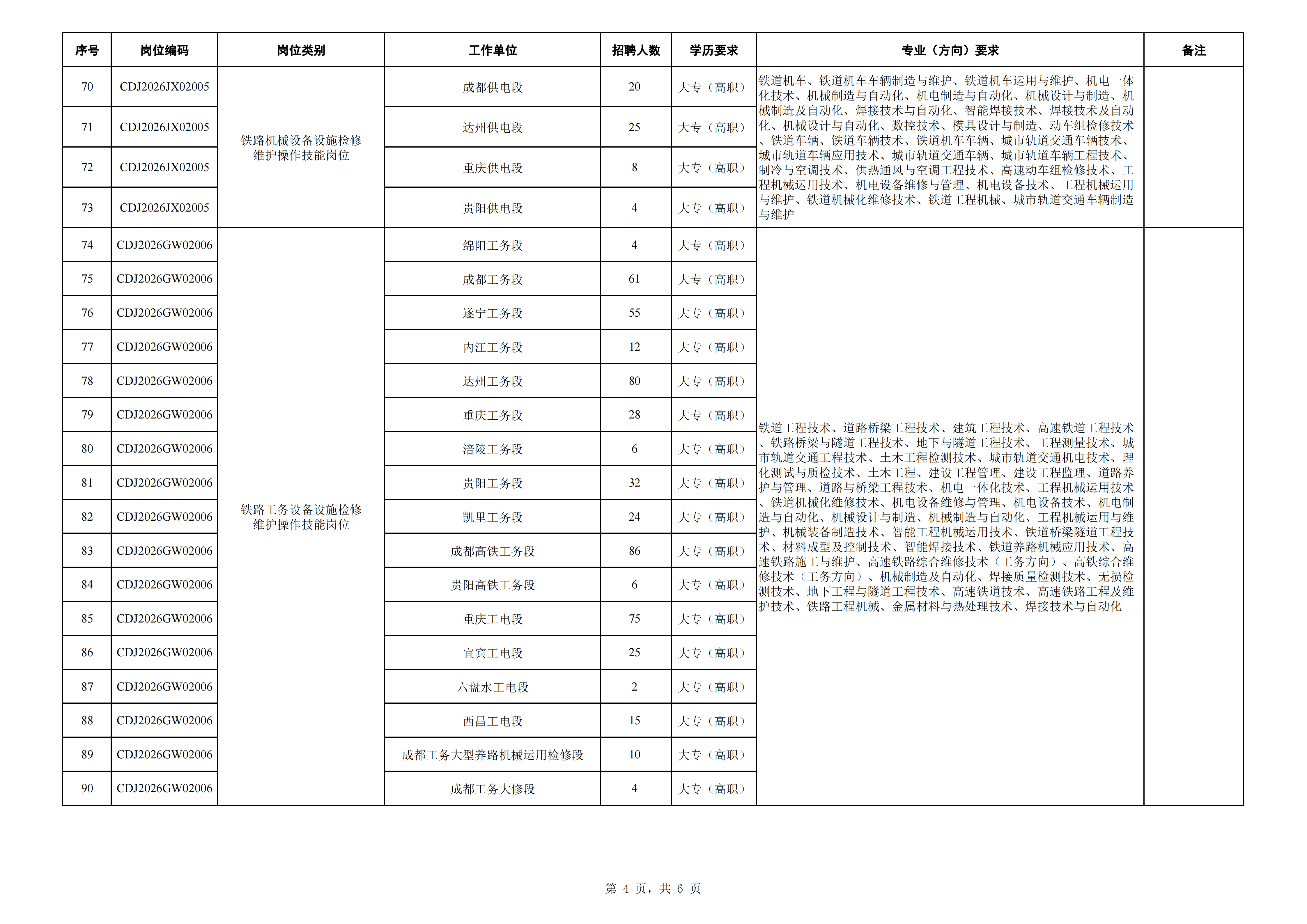 4.身心健康,具有良好的心理素质,听力、视力良好,辨色力正常,无色盲色弱,具备正常履行岗位职责的身体条件,符合招聘岗位职业健康规范标准。其中岗位编码为CDJ2026JW02004岗位,要求身体条件符合《铁路机车车辆驾驶人员健康检查规范》(TB/T3091-2019)规定标准。
