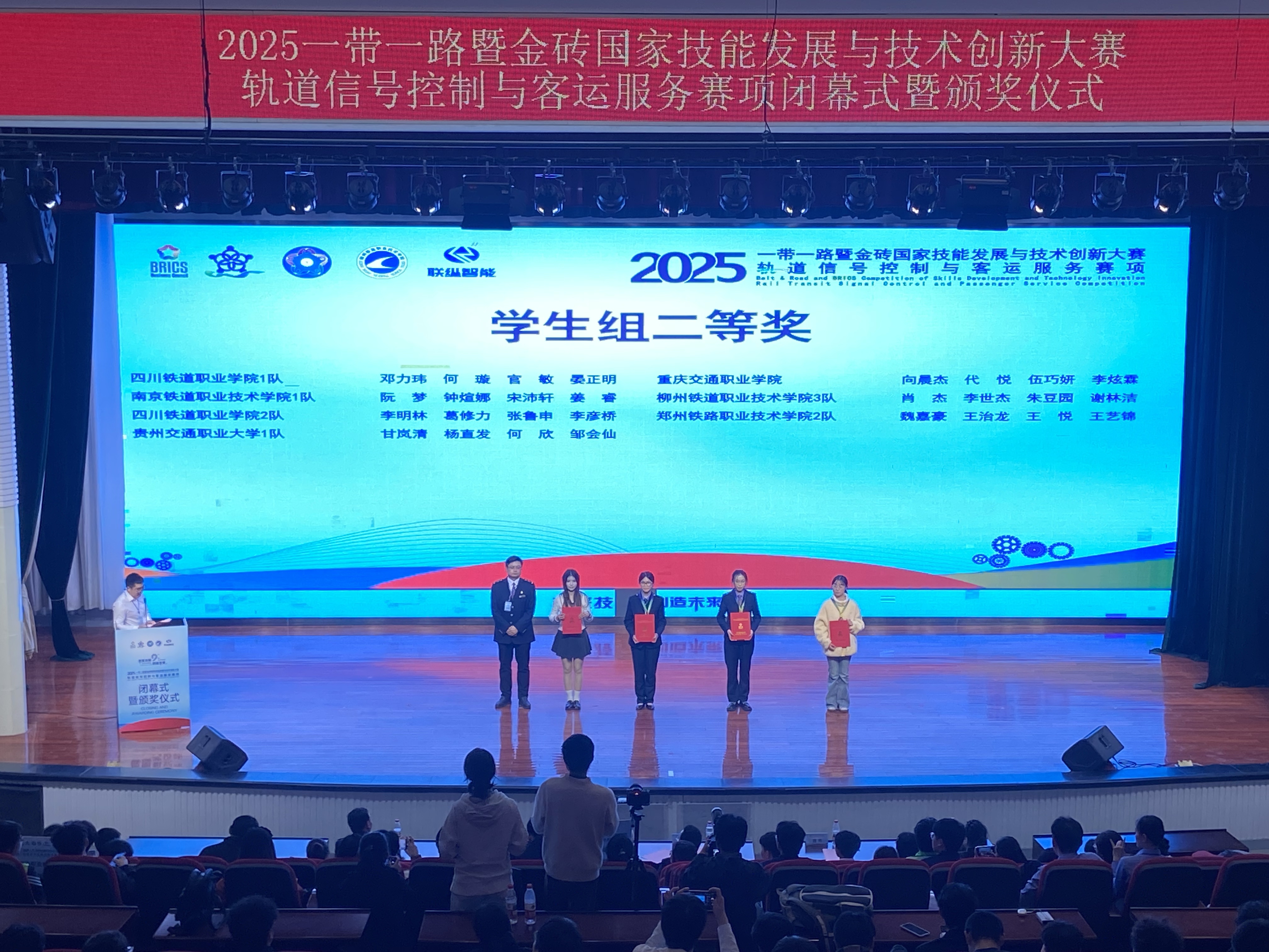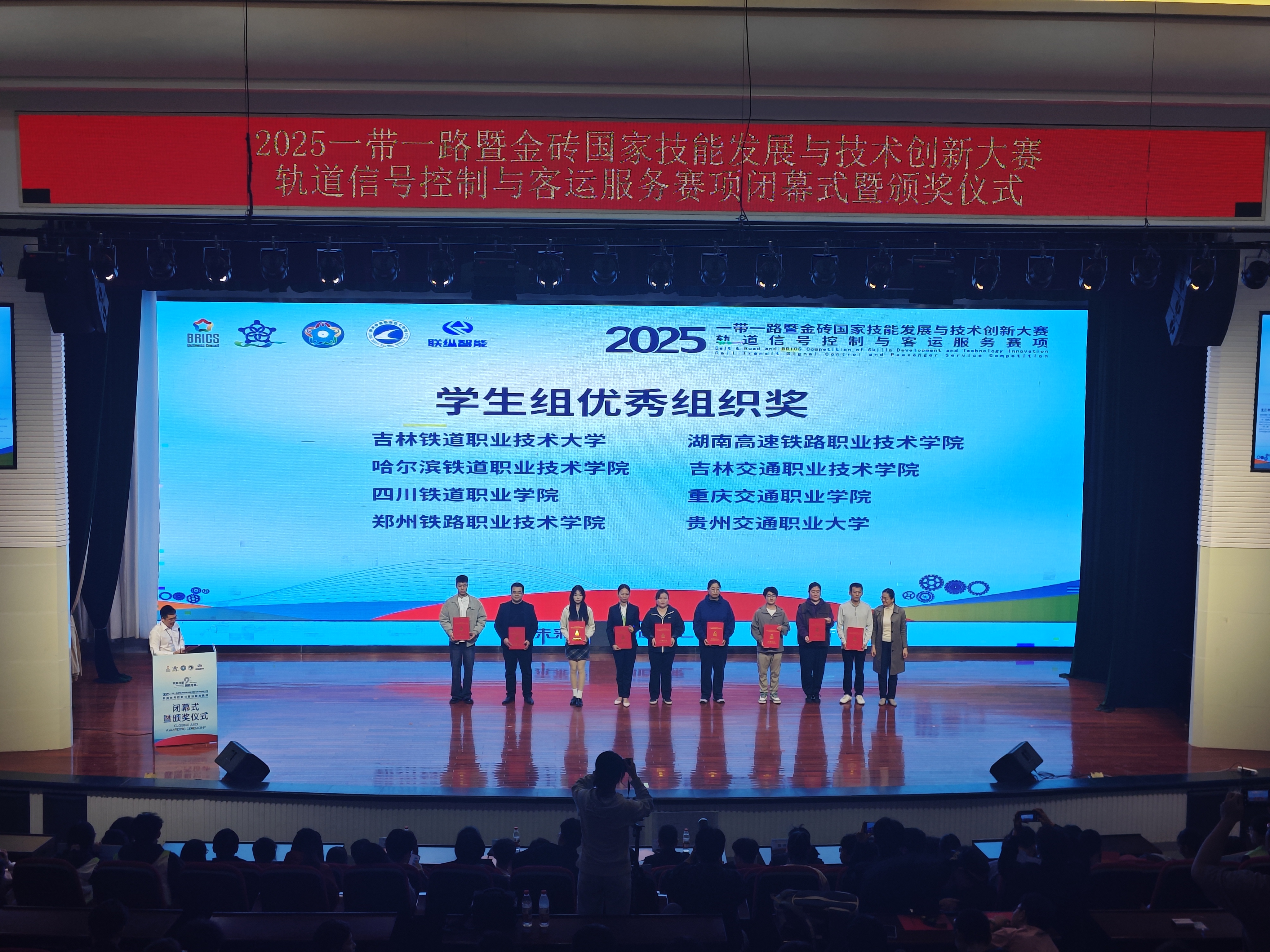 12月20日,2025“一带一路”暨金砖国家技能发展与创新大赛轨道信号与客运服务赛项顺利闭幕,我校电子工程学院和艺术学院组建的团队凭借扎实的专业技能、出色的团队协作能力,在比赛中脱颖而出,斩获二等奖1项,三等奖1项,学校荣获“优秀组织奖”。