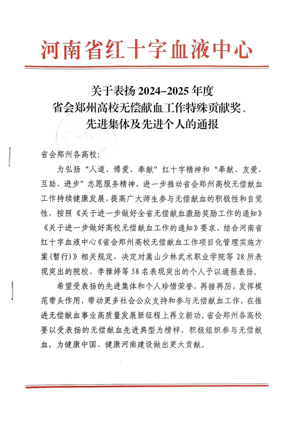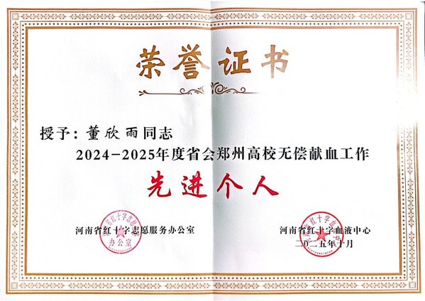 近日,河南省红十字血液中心公布《关于表扬2024-2025年度省会郑州高校无偿献血工作特殊贡献奖、先进集体及先进个人的通报》,我校荣获无偿献血工作先进集体,董欣雨等4名师生荣获无偿献血工作先进个人。