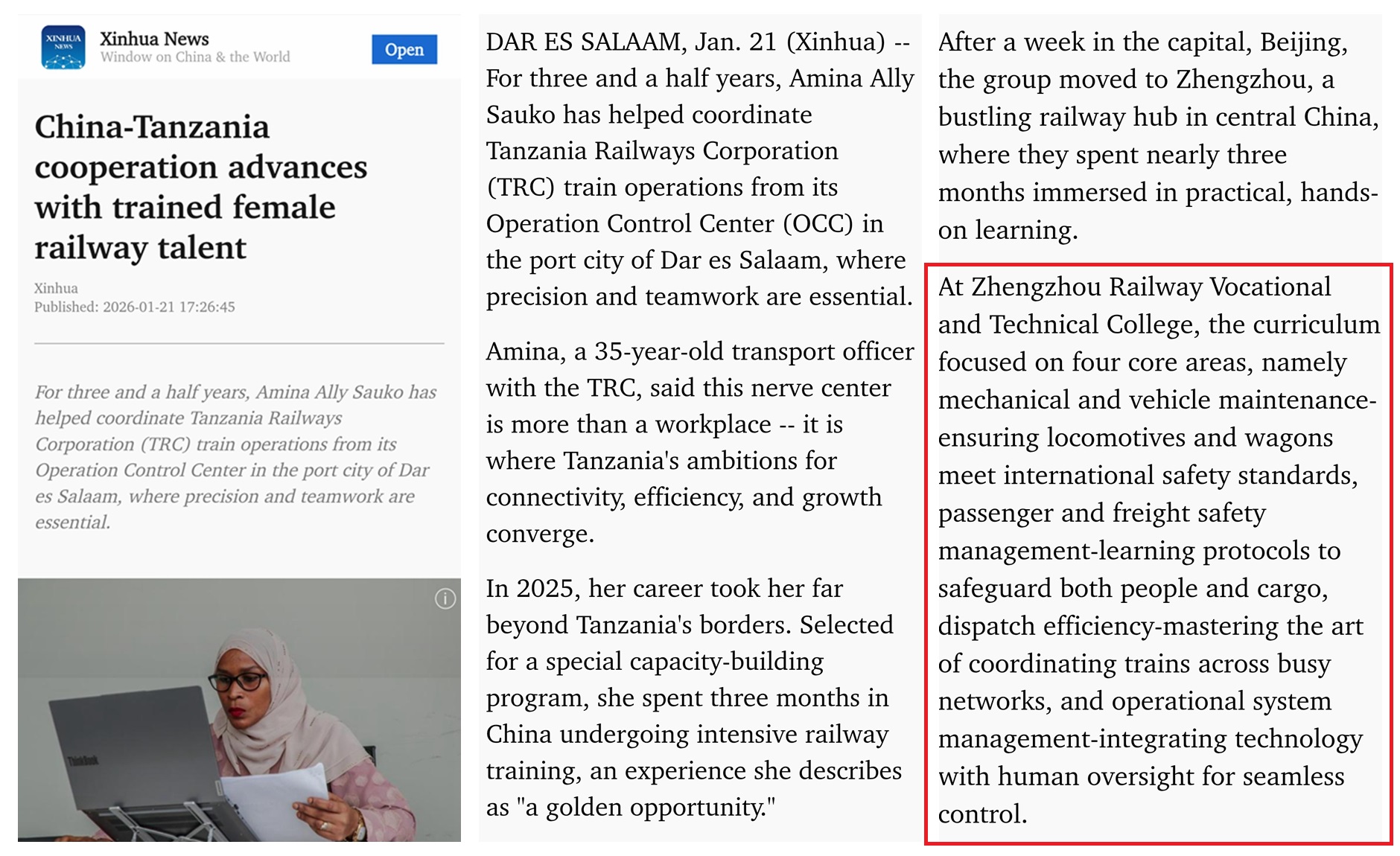 近日,新华社对我校坦桑尼亚学员Amina Ally Sauko进行独家专访。作为我校与北京交通大学联合承办的“坦桑尼亚铁路公司员工培训项目”学员代表,Amina在专访中深情分享了自己在中国的学习经历、成长感悟与丰硕收获,生动展现了中非铁路领域人才培养合作的显著成效。