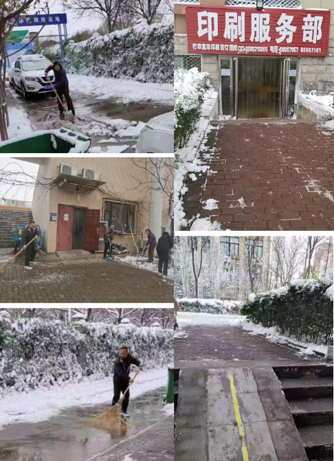 1211日,郑州市迎来今年冬天以来的第一场降雪,大雪的来临奏响了冬日序曲,白雪纷飞,银装素裹,分外妖娆!雪花点缀了校园的每一个角落,积雪让人欢乐的同时也给师生的出行带来诸多不便,为确保全校师生的在校安全和教育教学的正常进行,校产中心 博源公司倡议志愿者纷纷投入到扫雪活动中,开展“清冰除雪”志愿服务活动。