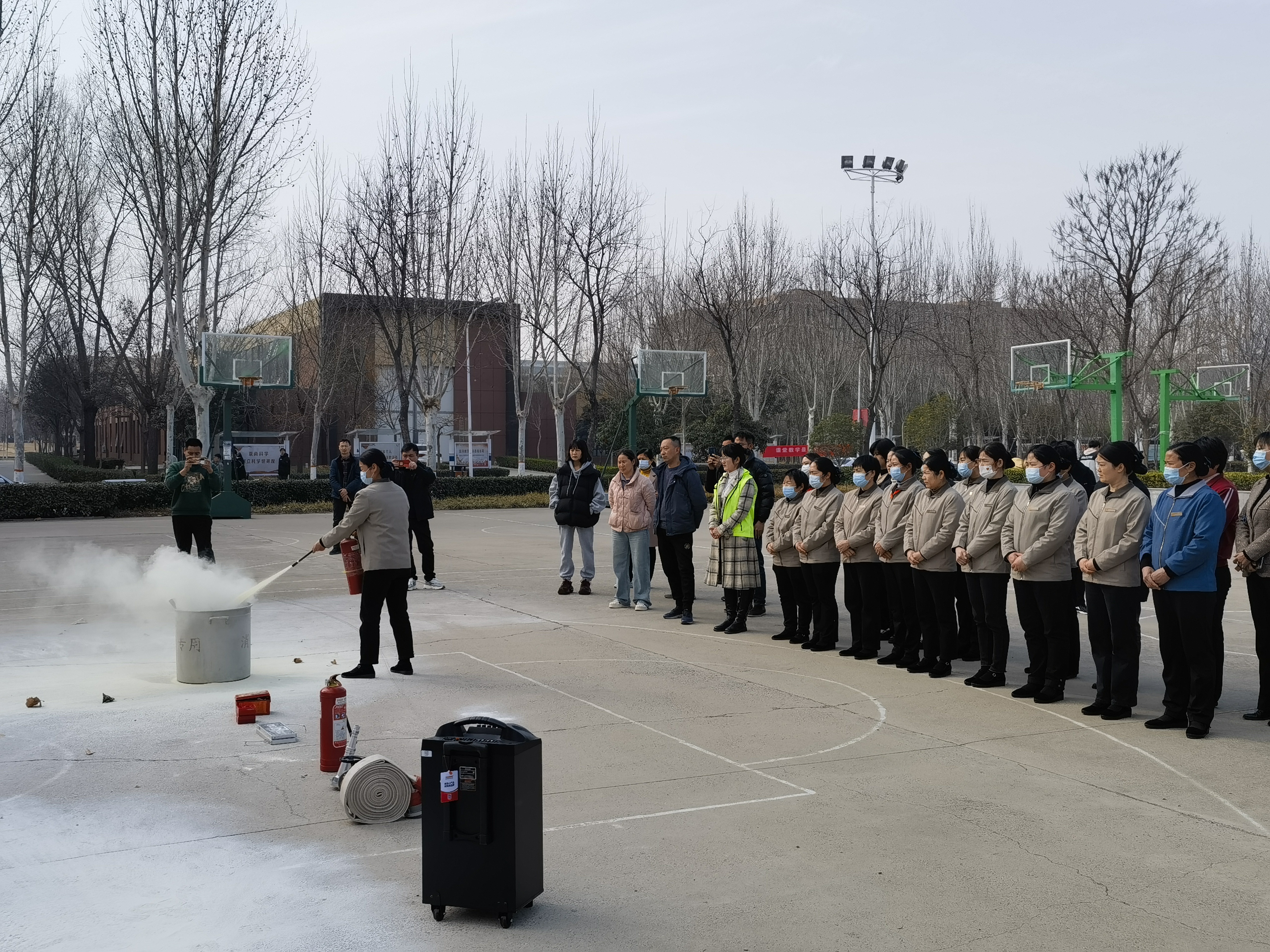 保卫处消防专员结合近年校园火灾典型案例,深入剖析了几起校园常见隐患的成因及危害,强调“防患于未然”的重要性。通过展示与数据对比,职工们直观感受到火场蔓延的迅猛性与初期处置的关键作用。并现场演示干粉灭火器“提、拔、握、压”四步操作法,所有参与人员进行灭火实操演练。