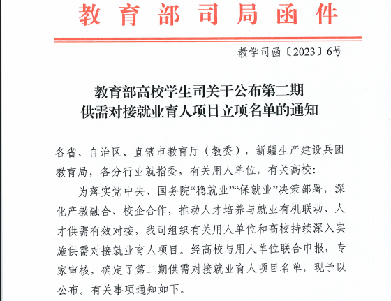 近日,教育部高校学生司发布《关于公布第二期供需对接就业育人项目立项名单的通知》(教学司函〔2023〕6号),其中我院的就业实习基地项目获批立项。