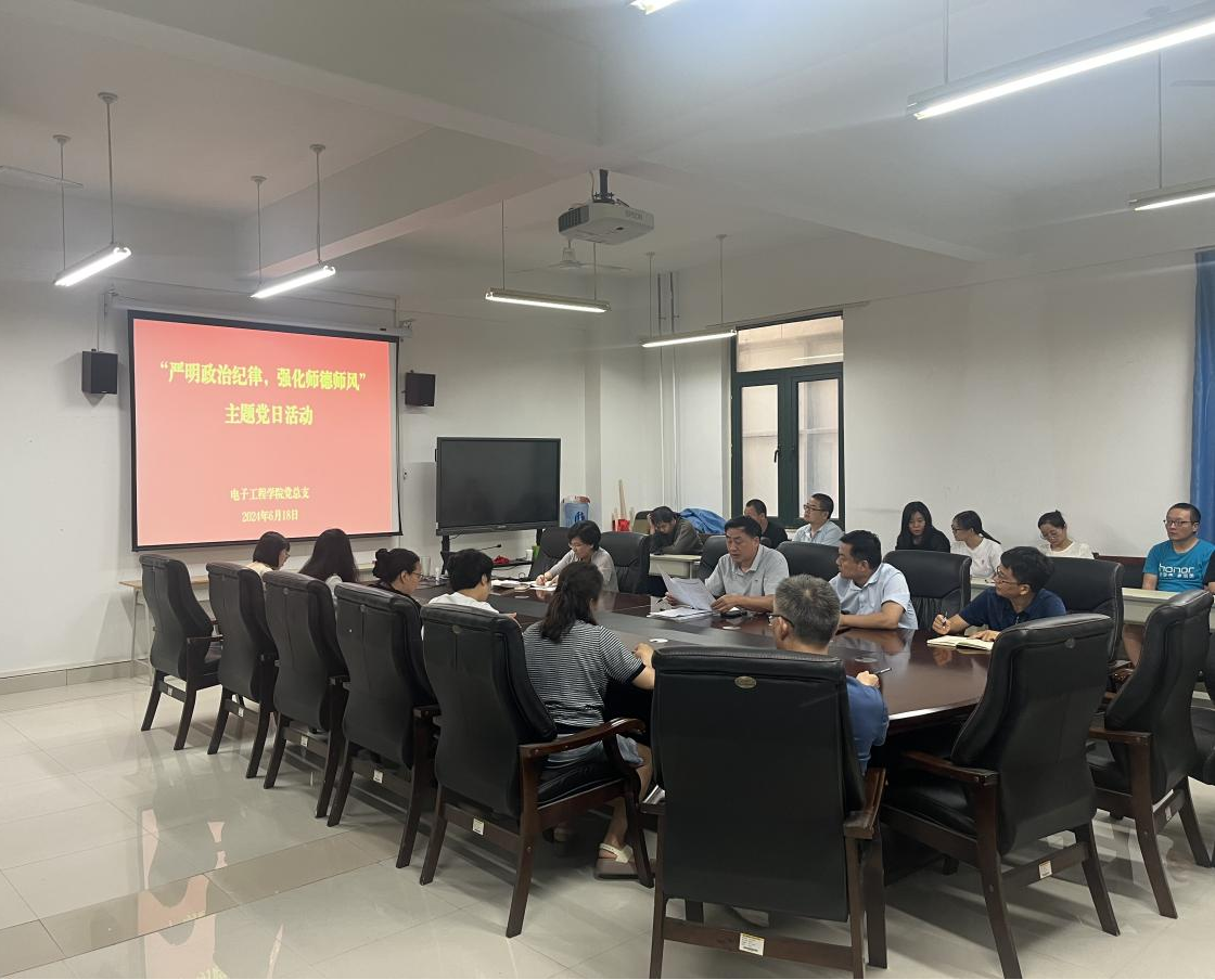 为深入学习贯彻党的二十大精神,扎实推进党纪学习教育,6月18日,电子工程学院党总支开展“严明政治纪律,强化师德师风”主题党日活动,学院全体党员参加了会议。
