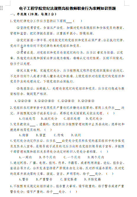 为扎实开展好党纪学习教育,更好地使全体党员学习掌握《中国共产党纪律处分条例》的各项内容,牢固树立党规、党纪意识。6月11日,电子工程学院党总支在学院会议室举行党纪法规暨高校教师职业行为准则知识大题活动,学院全体党员参加。