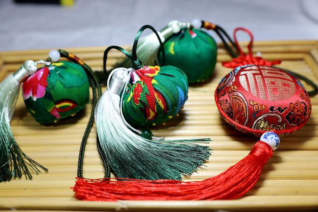 端午节小孩佩香囊,传说有避邪驱瘟之意,实际是用于襟头点缀装饰。香囊内有朱砂、雄黄、香药,外包以丝布,清香四溢,再以五色丝线弦扣成索,作各种不同形状,结成一串,形形色色,玲珑可爱。