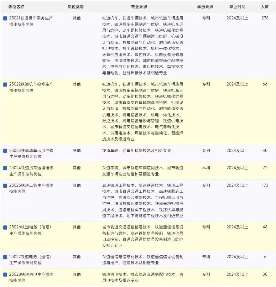 (二)符合招聘岗位要求的专业条件,列入国家招生计划,2025年和2024年毕业的全日制普通高等院校大专 (高职) 学历毕业生。在校期间所学专业为铁路方向或所学主要课程中包含铁路专业课程。
